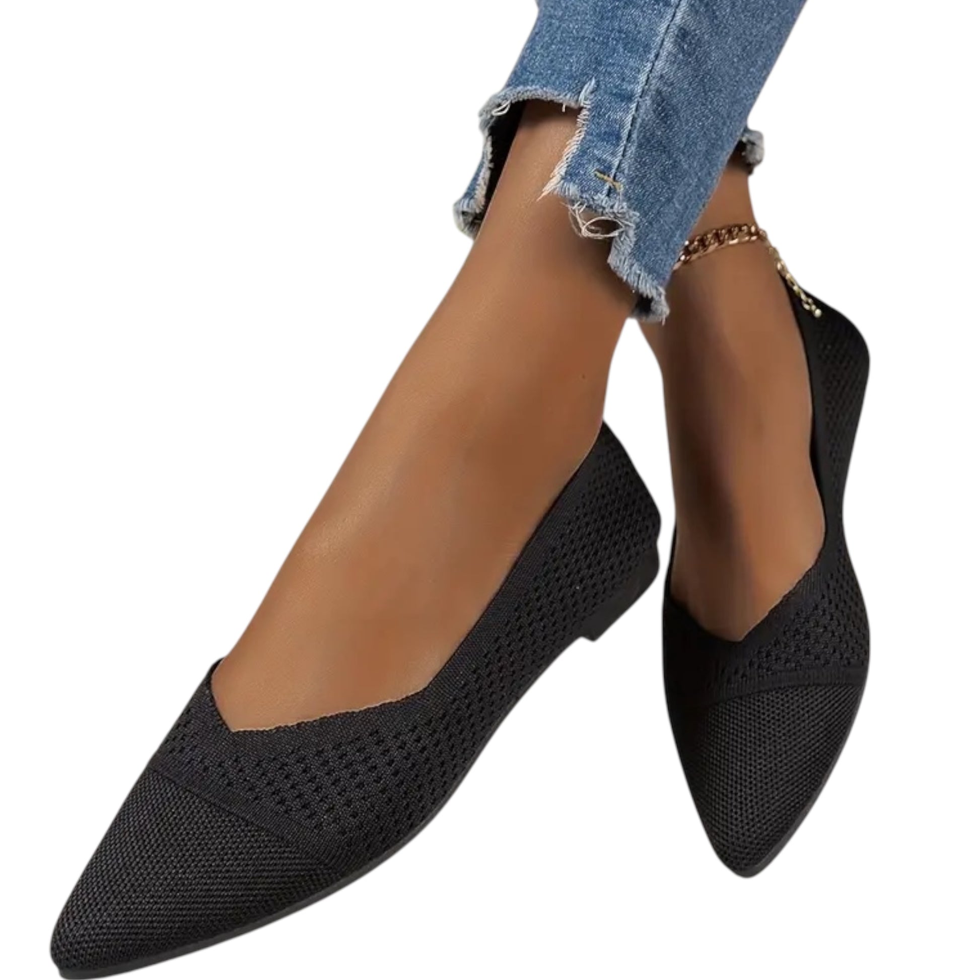 Balerina elegante të markës AF 👠, në ngjyrë të zezë klasike, me dizajn modern dhe të rehatshëm. Pjesa e sipërme është prej materiali të frymëmarrjes me teksturë të thurur, që përshtatet bukur me këmbën dhe ofron rehati gjatë gjithë ditës. Forma e mprehtë e tyre shton një prekje shik dhe i bën të përshtatshme si për përditshmëri, ashtu edhe për ambiente pune apo evente casual.