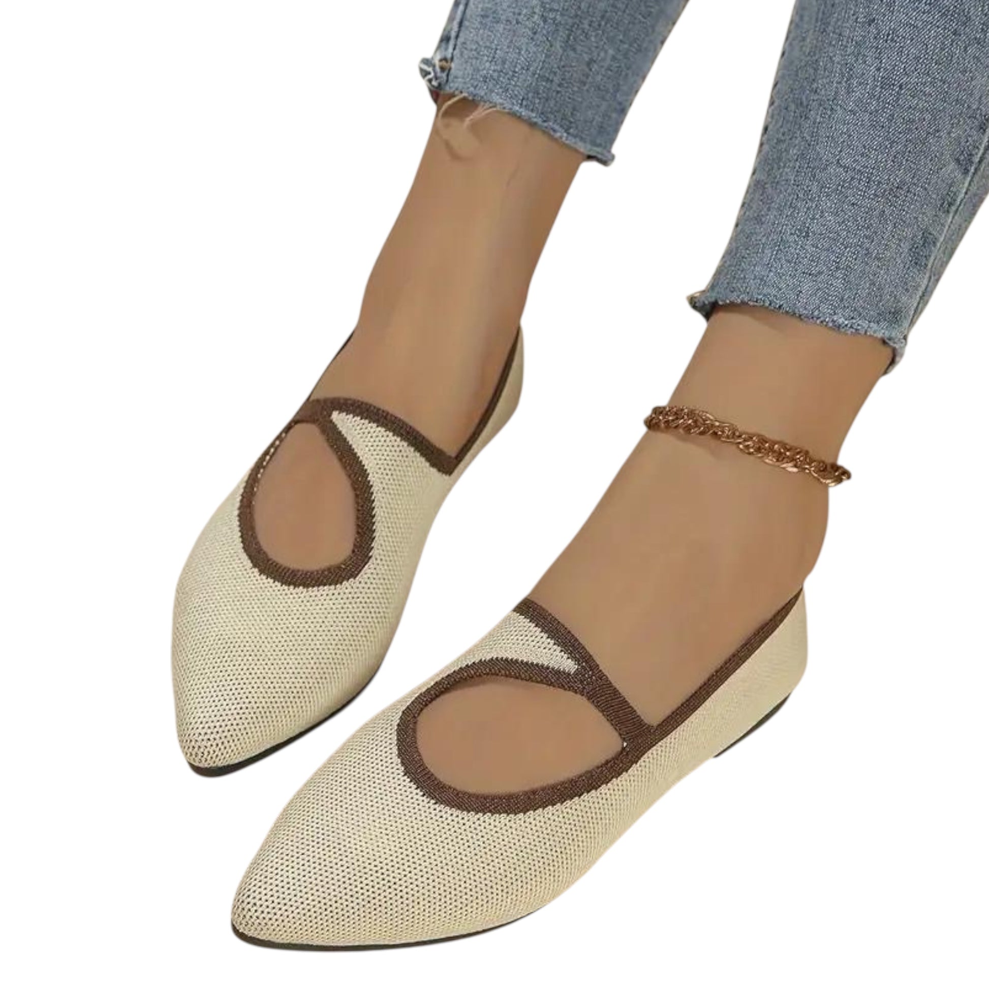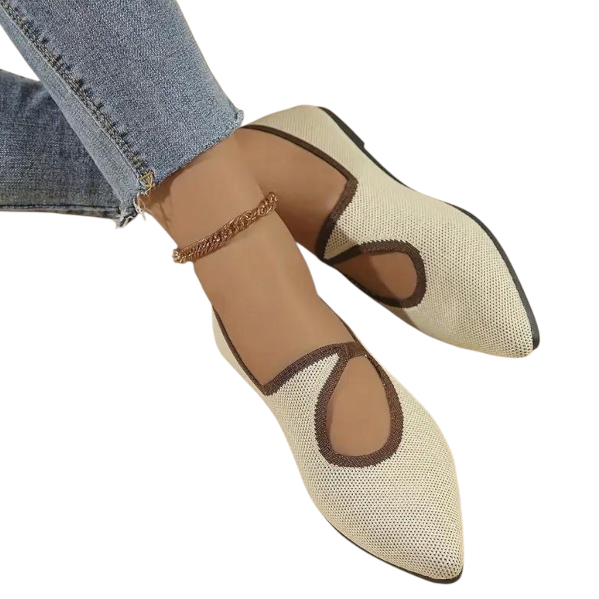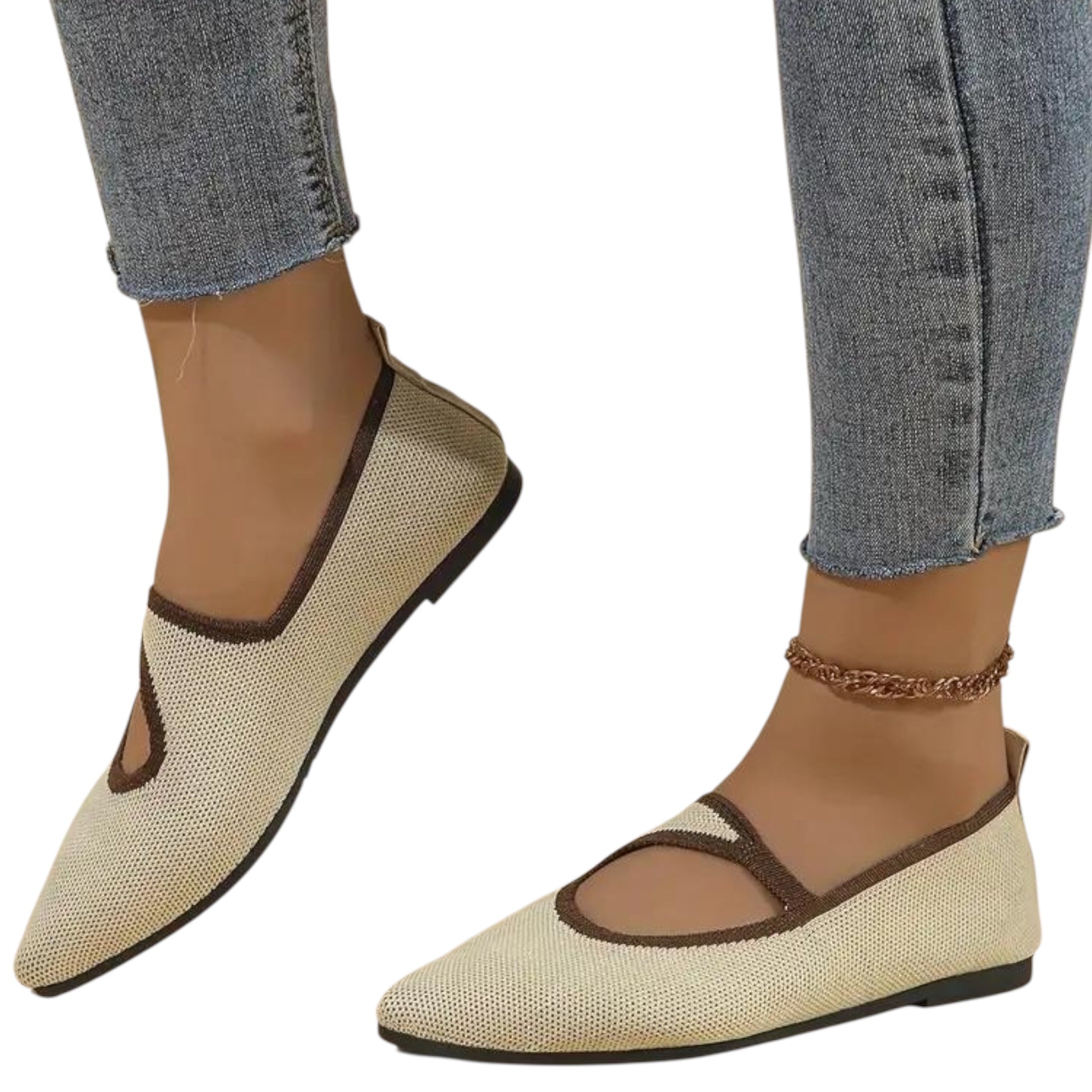 Balerina elegante në ngjyrë bezhë me detaj kafe në skaje, perfekte për një pamje minimaliste dhe moderne. Të lehta, të rehatshme dhe shumë funksionale, këto balerina kombinohen lehtësisht si me veshje casual, ashtu edhe me kombinime elegante. Forma me majë të hollë i shton finesë, ndërsa materiali i frymëmarrshëm siguron rehati gjatë gjithë ditës.