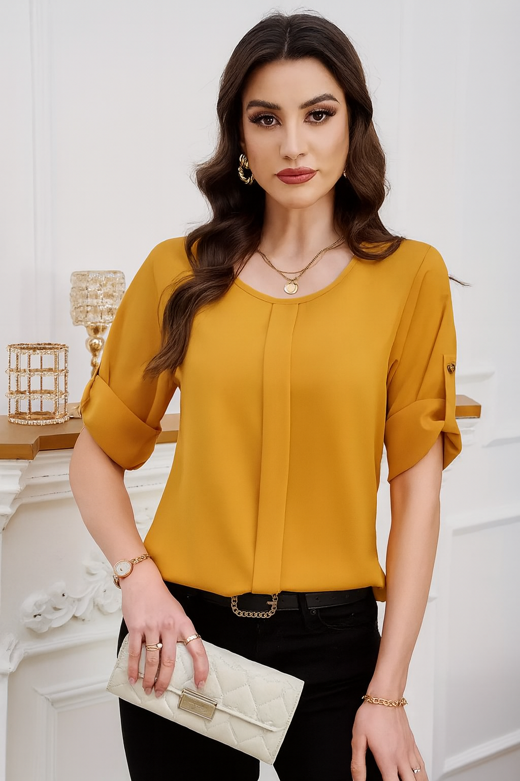 Bluzë këmishë pranverore e lehtë me palosje përpara. Komode falë materialit me cilësi të lartë.