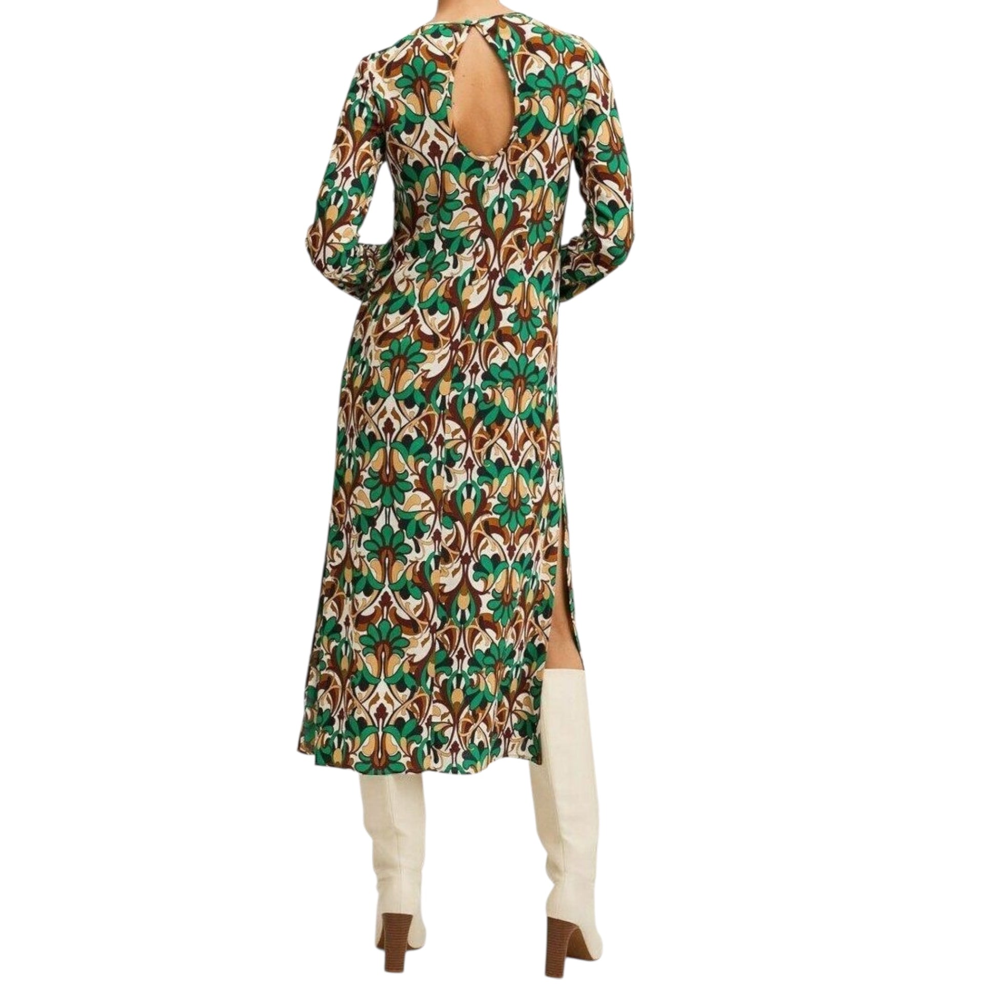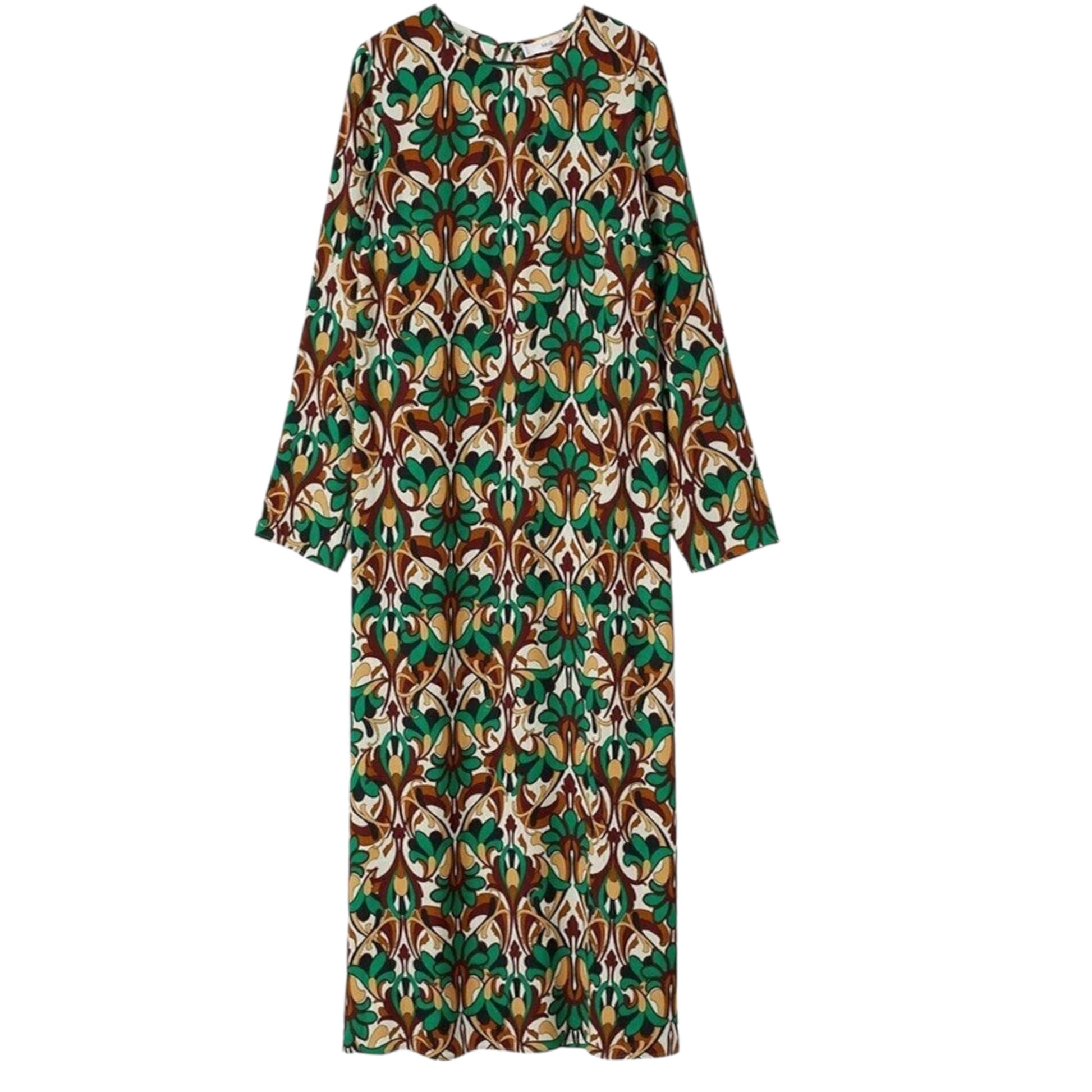 Sillni stilin vintage në garderobën tuaj me këtë fustan unik, të gjatë dhe me mëngë të gjata. Dizajni i tij spikat me printin elegant shumëngjyrësh në nuanca jeshile, kafe dhe bezhë, duke krijuar një pamje moderne me frymë retro.