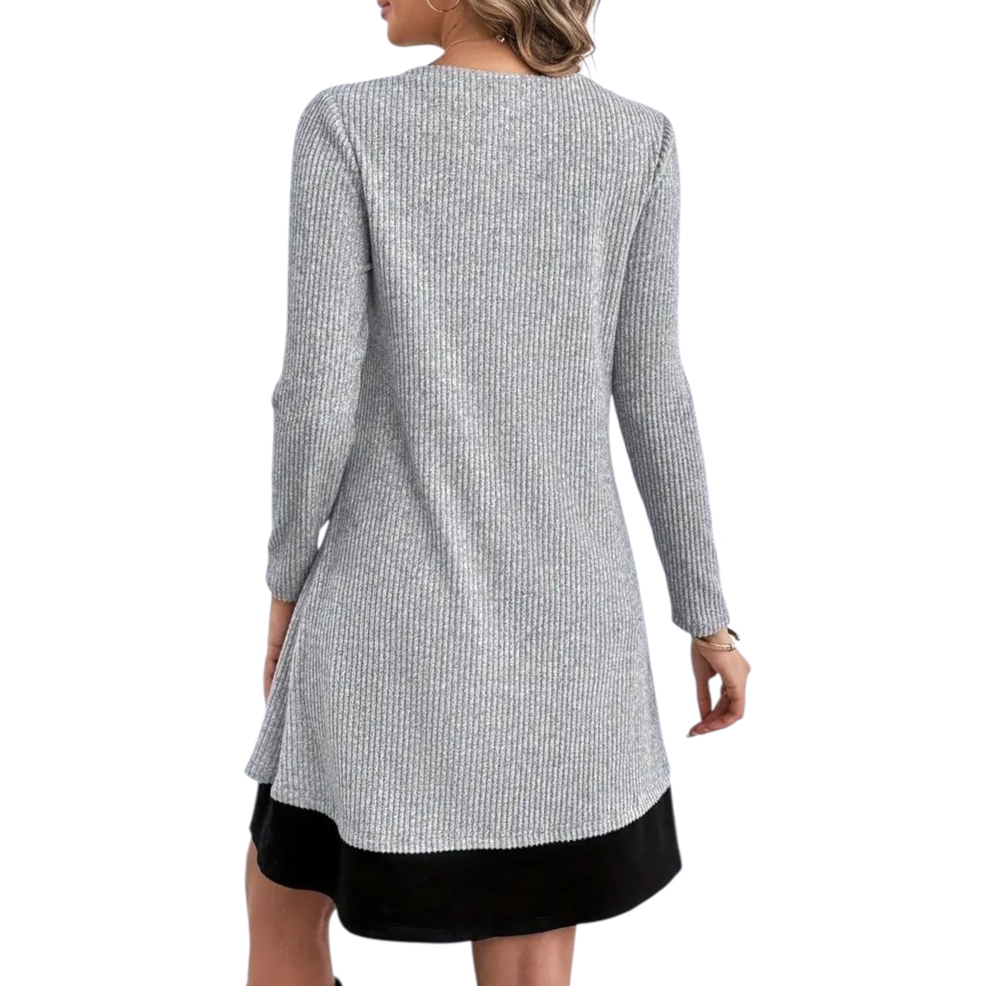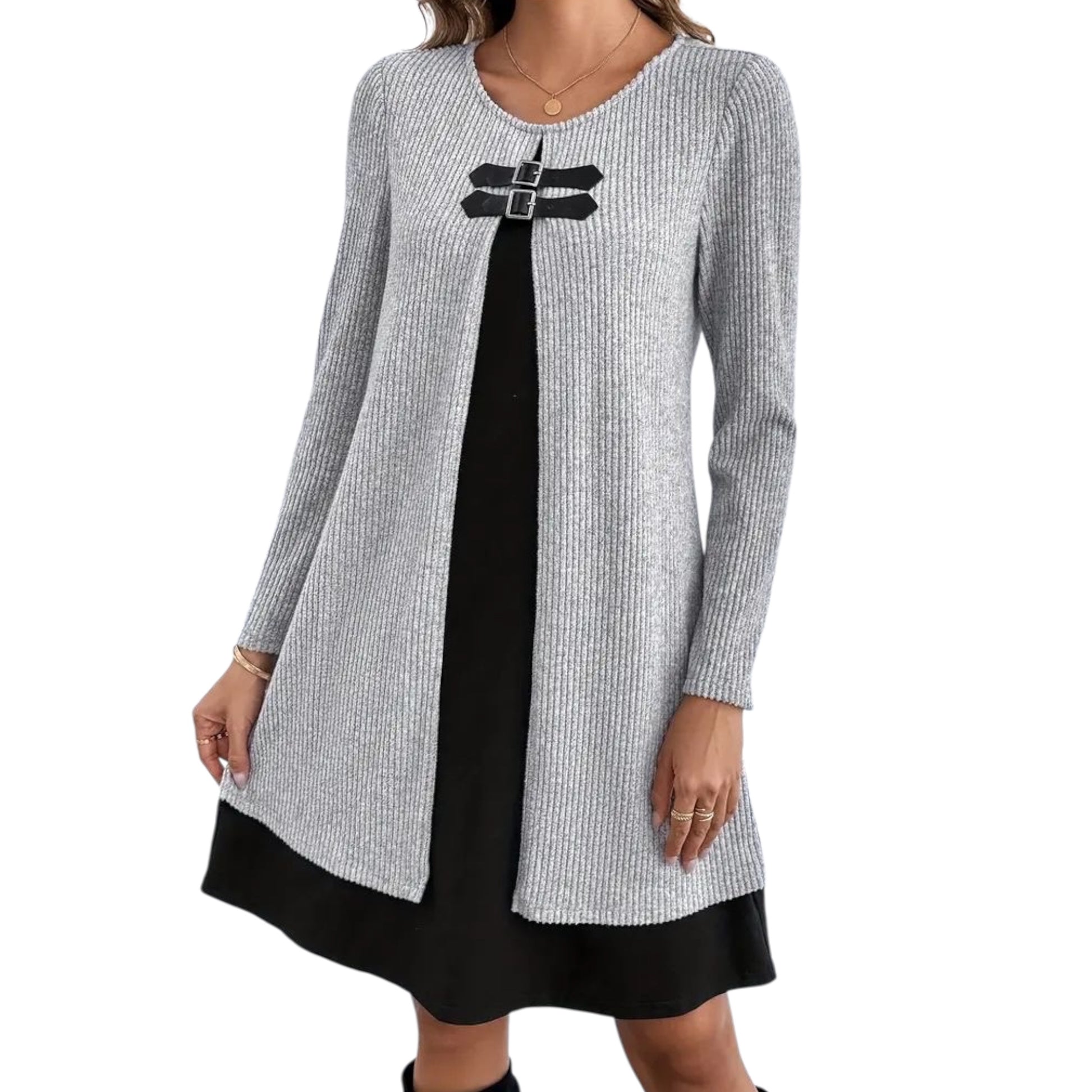 Shto një prekje elegance në garderobën tënde me këtë fustan modern dhe unik. Materiali gri me teksturë të imët dhe kontrasti i zi krijojnë një pamje të sofistikuar që bie në sy menjëherë. Dy rripat dekorativë me kapëse në pjesën e përparme i japin personalitet dhe stil, ndërsa prerja e lirshme ofron rehati gjatë gjithë ditës. Një zgjedhje perfekte për punë, takime apo evente ku dëshiron të dukesh me klas, pa humbur komoditetin.