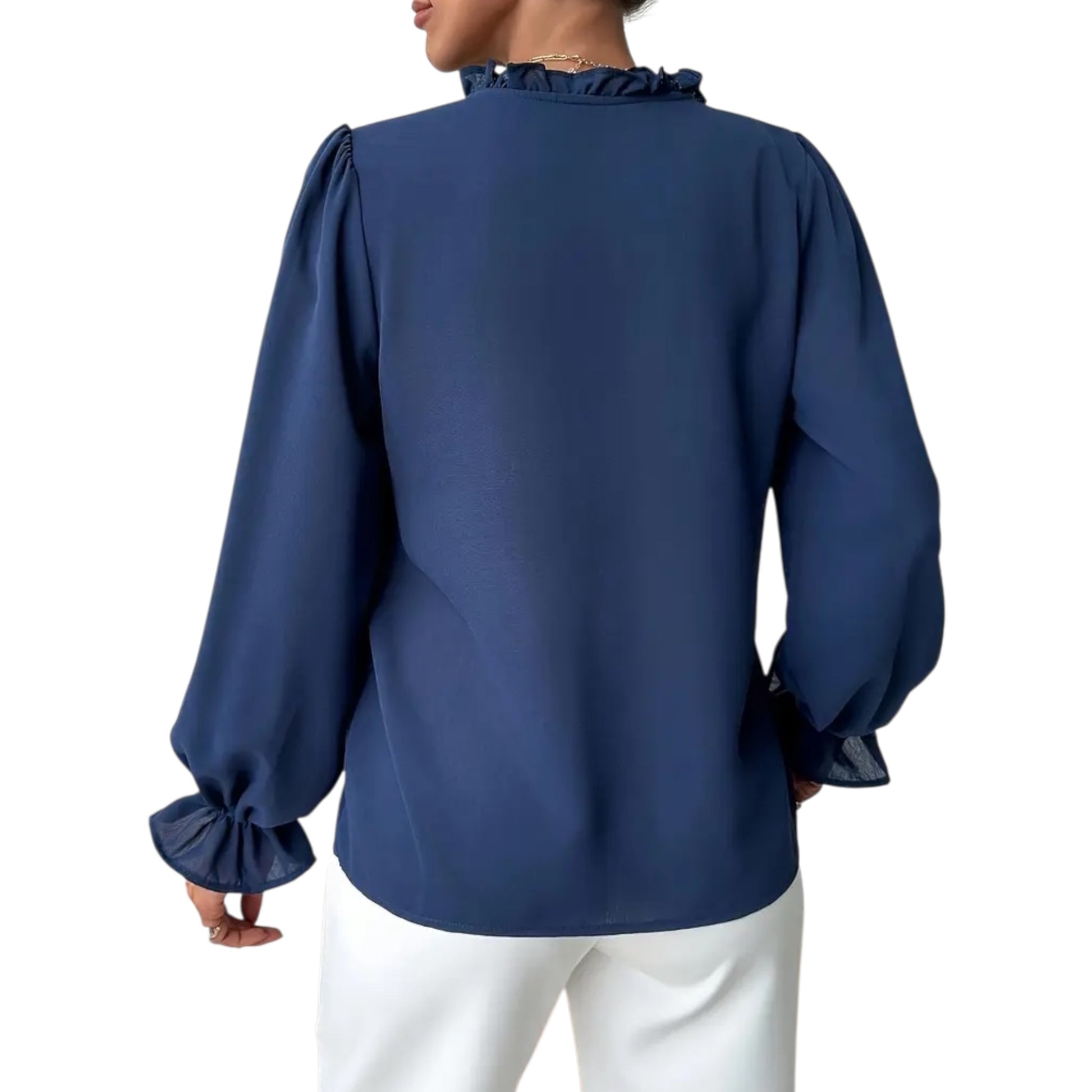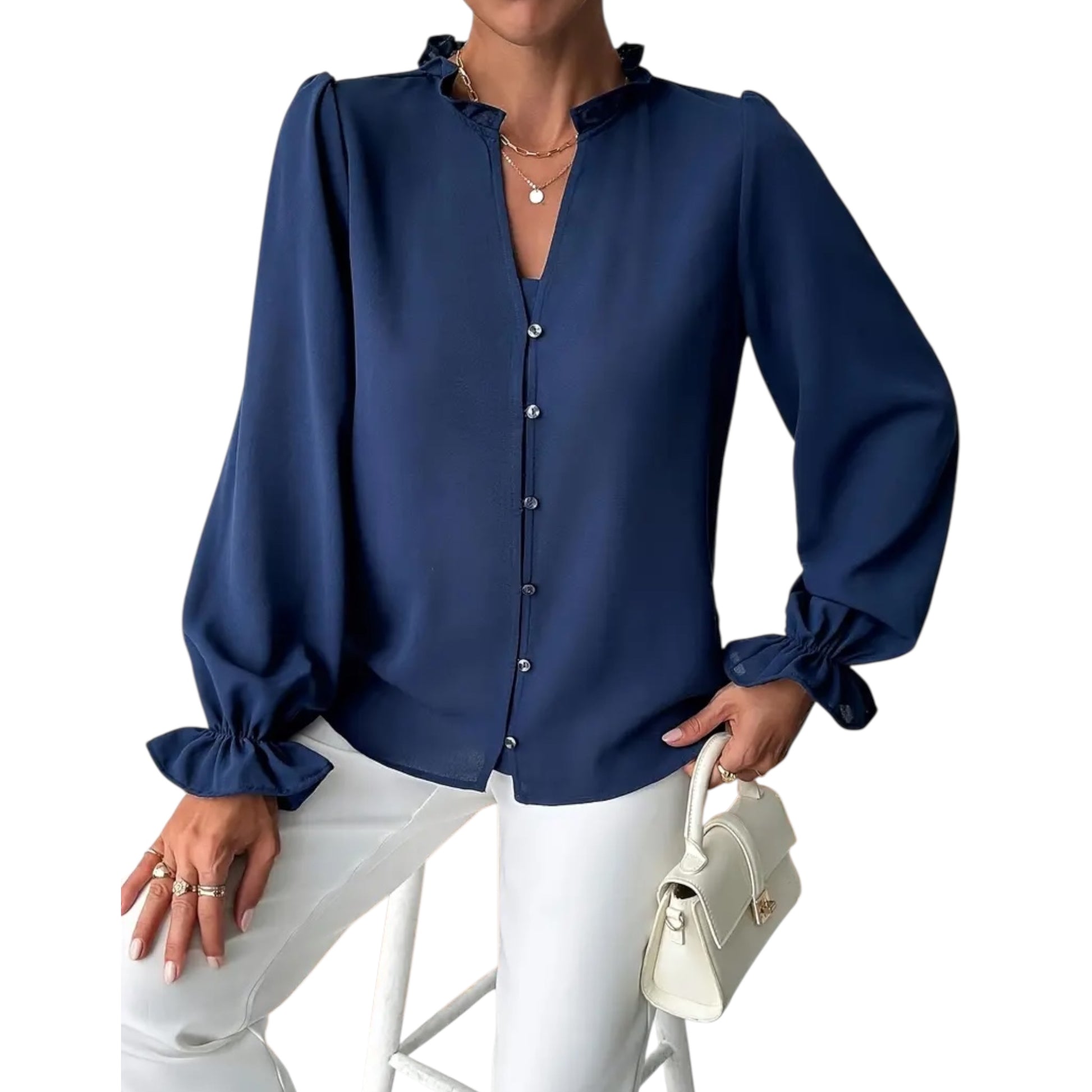 kemishë Elegante për Femra me Ngjyrë të Plotë, Jakë me Shirita Rrudhur dhe Mëngë me Fund të Rrudhur – 100% Poliester, Pjesërisht e Hapur, Me Kopsa.Kjo Kemishë e rafinuar sjell një kombinim perfekt të stilimit të butë femëror me detaje të punuara me kujdes. E dizajnuar me jakë V të thellë me shirit rrudhur që shton hijeshi dhe një prekje romantike, si dhe mëngë të gjata me fund të rrudhur për një efekt të sofistikuar.