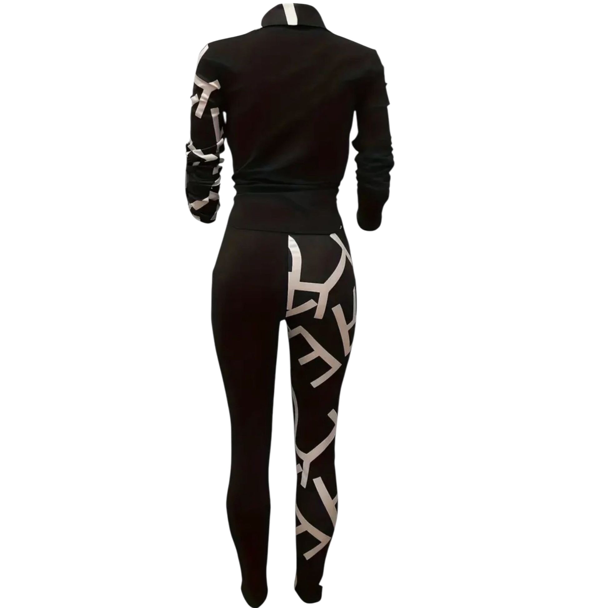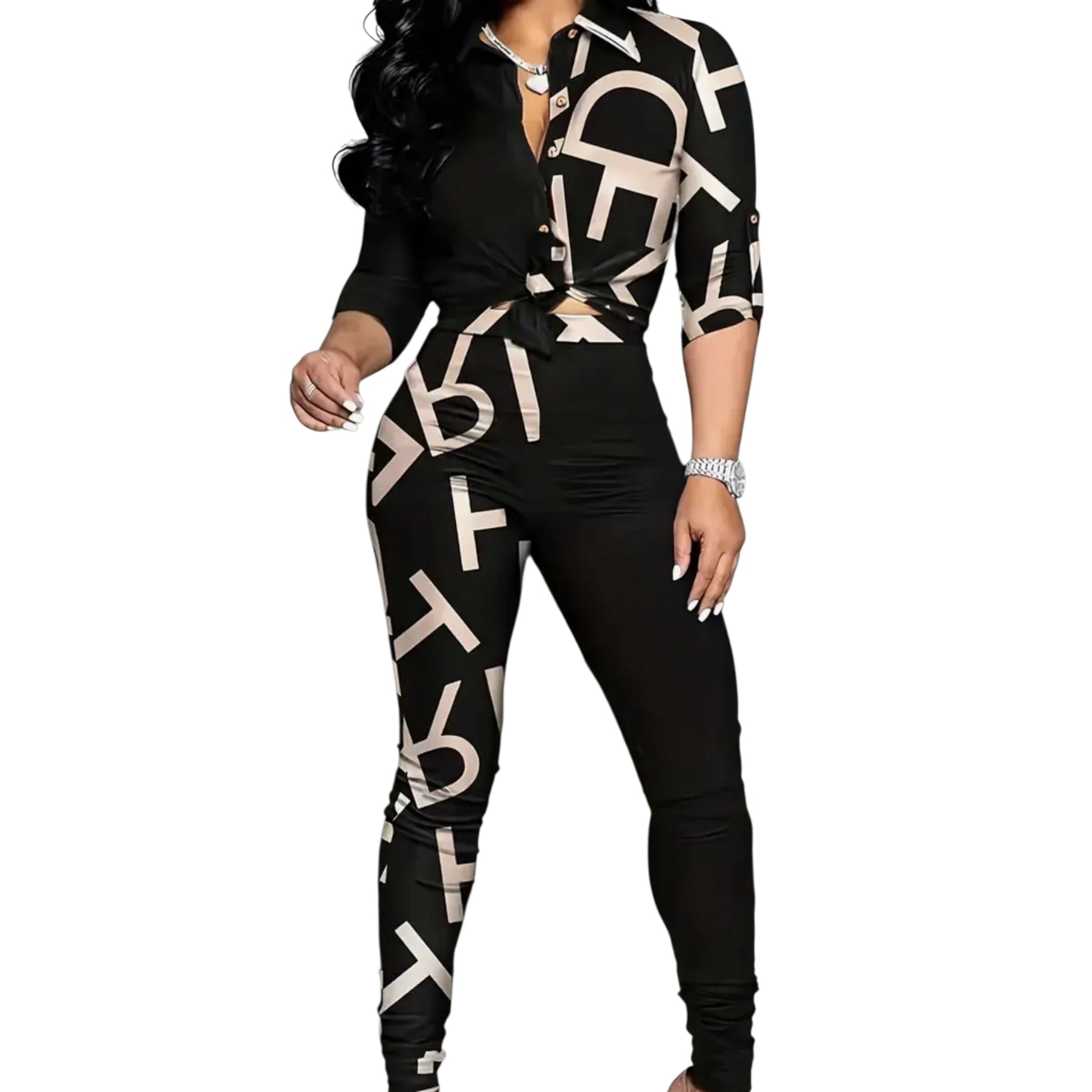 Ky kostum modern dhe i sofistikuar përbëhet nga këmishë me kopsa dhe pantallona të ngushta me dizajn trupor. Me printe kontrastuese në ngjyrë beix mbi të zezë, ky set është perfekt për të krijuar një pamje të guximshme dhe plot stil. Materiali elastik ofron rehati dhe përshtatje ideale, duke e bërë të përshtatshëm si për evente ashtu edhe për dalje elegante.