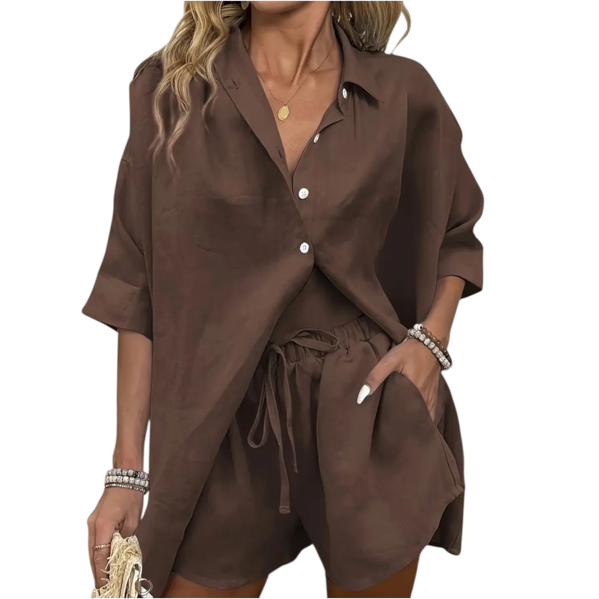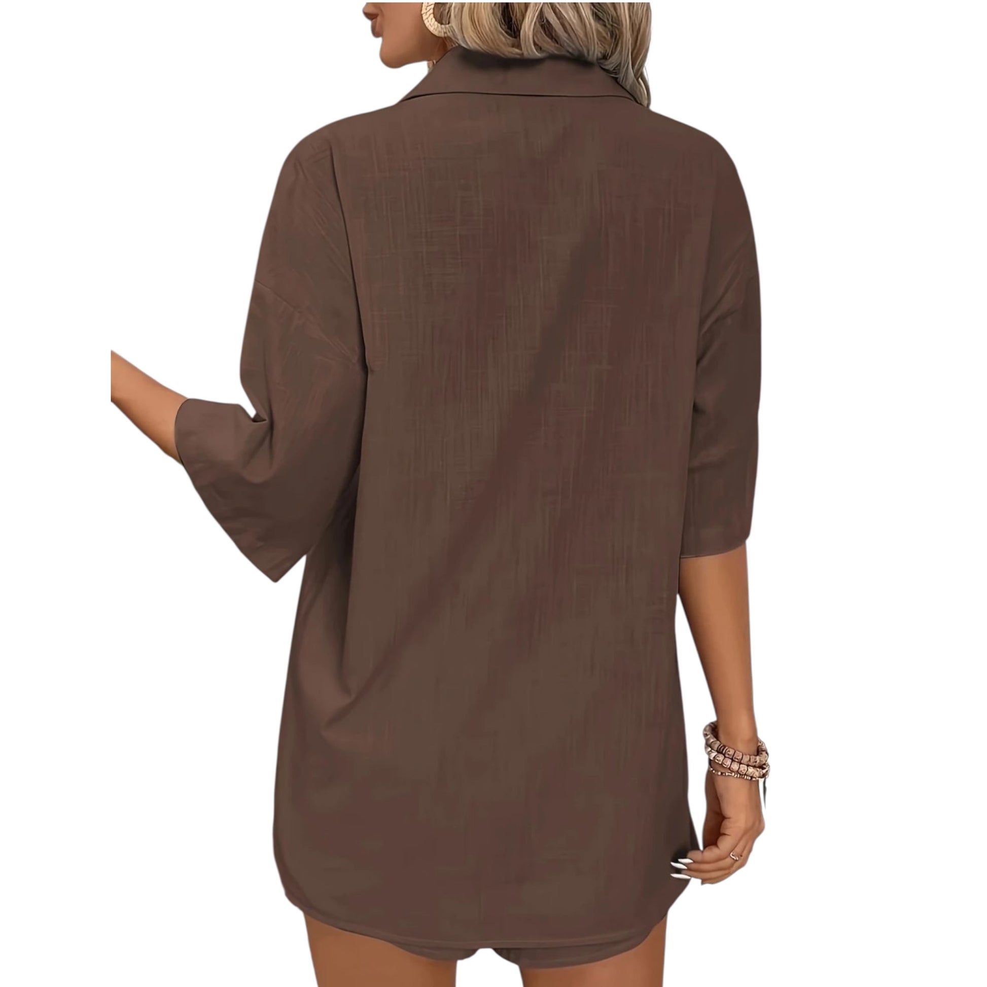 Set Veror për Gra – Këmishë me Mëngë të Shkurtra dhe Pantallona të Shkurtra, Ngjyrë e Plotë, Stil Casual për Pushime