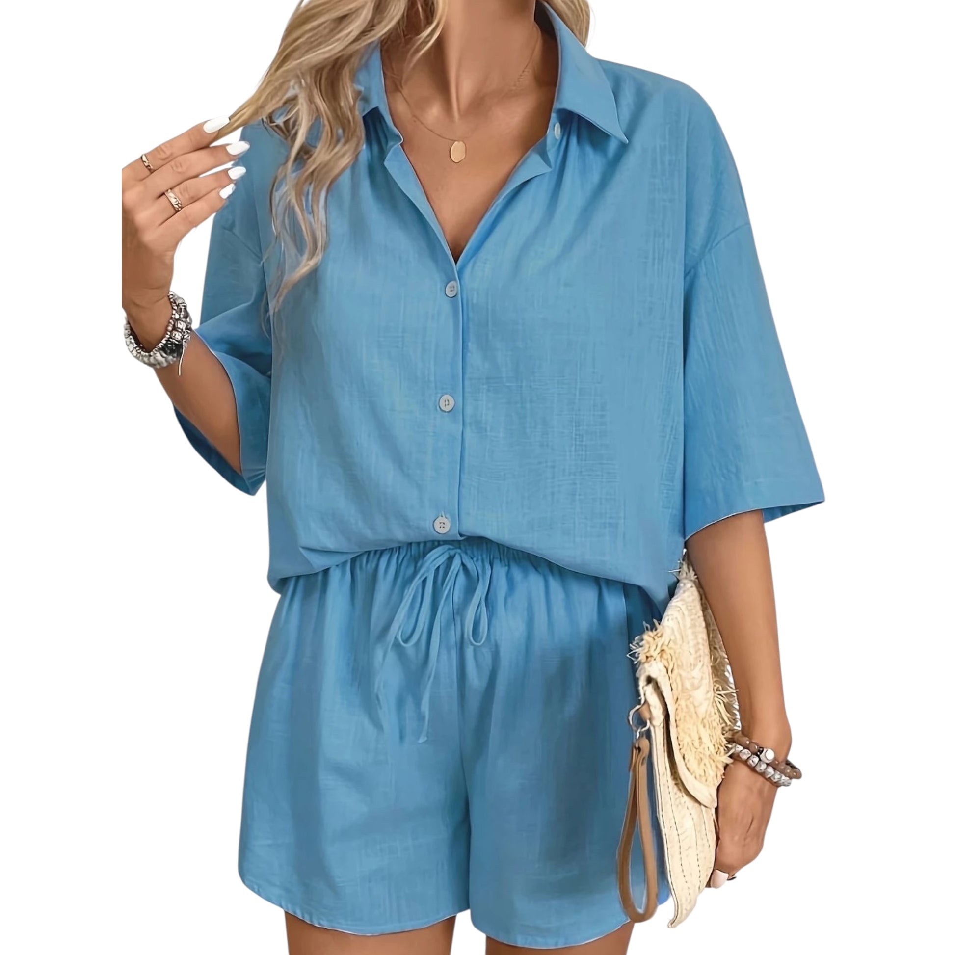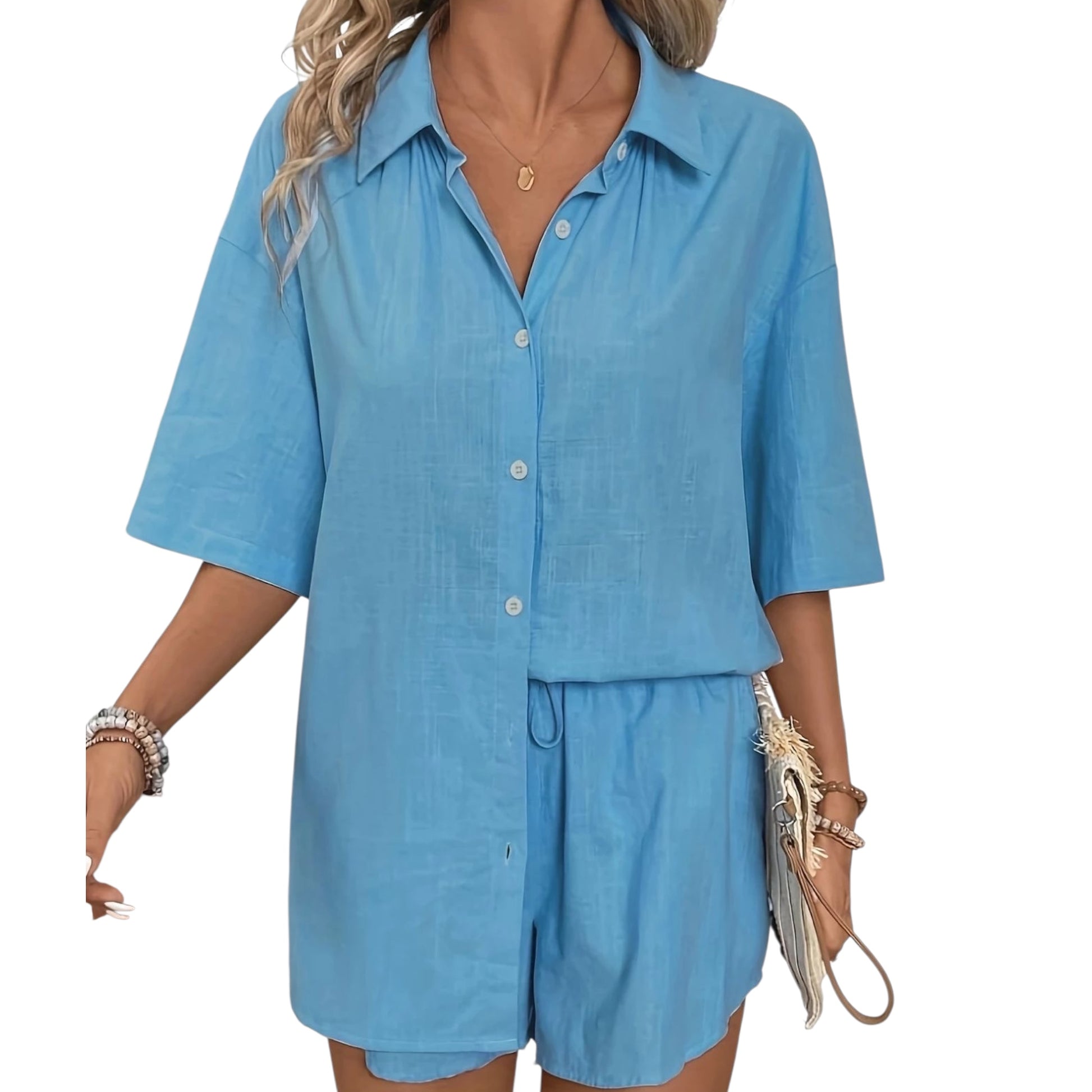 Ky set dy-pjesësh është kombinimi perfekt i rehatisë dhe elegancës verore. Përfshin një këmishë me mëngë të shkurtra dhe supe të zbuluara (off-shoulder), të kombinuar me pantallona të shkurtra të rehatshme. Ngjyra e plotë i jep thjeshtësi, ndërsa prerja e lirshme e bën ideal për ditët e pushimit.