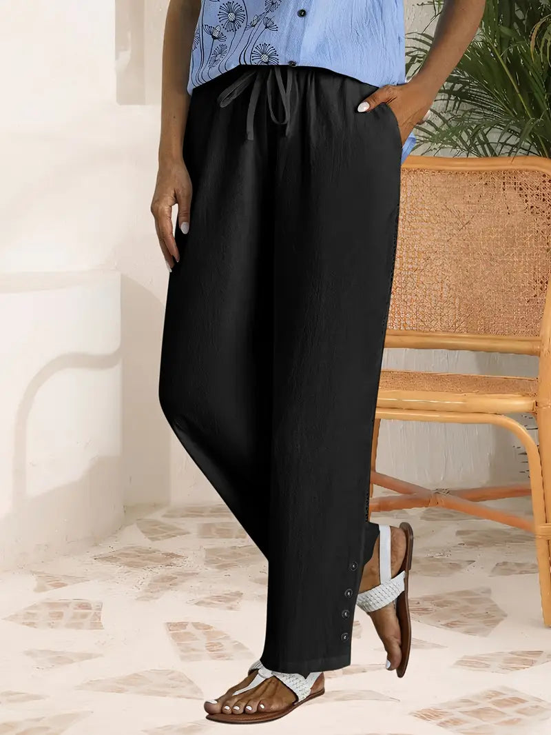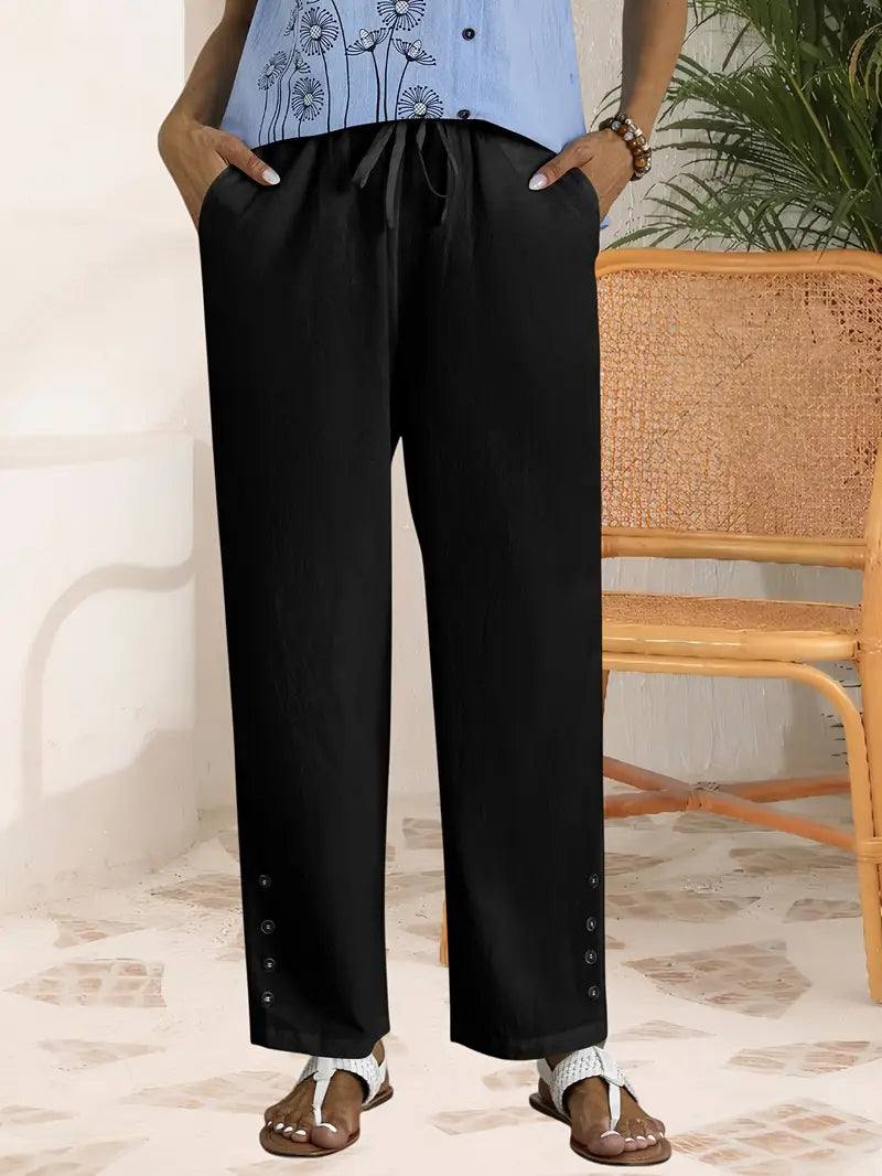 Pantallona të Drejta Casual për Femra me Bel Elastik & Rrip të Rregullueshëm – Me Dantellë Dekorative, të Zeza