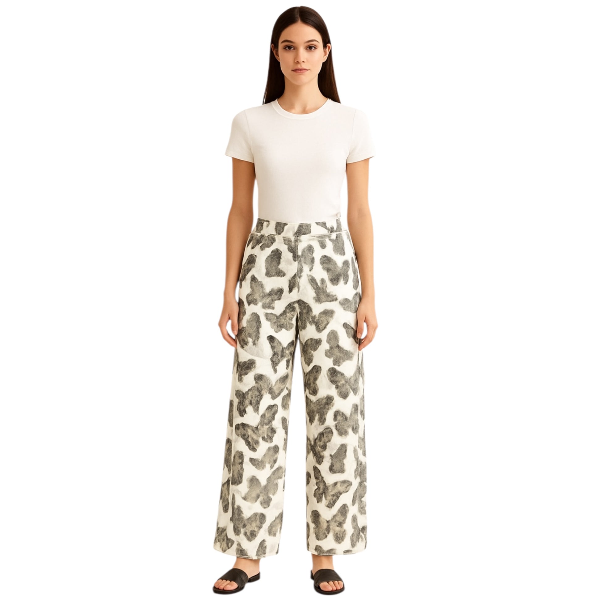 Pantallona të gjera me print fluturash, perfekte për një pamje të lirshme dhe moderne. Të punuara me material të lehtë dhe të rehatshëm, ofrojnë ndjesi freskie gjatë ditëve të ngrohta. Modeli me bel të mesëm dhe prerja e lirshme i bën ideale për kombinime si me bluza të thjeshta, ashtu edhe me këmisha elegante. Printi me flutura në nuanca gri mbi sfond të bardhë i jep një stil unik dhe tërheqës.