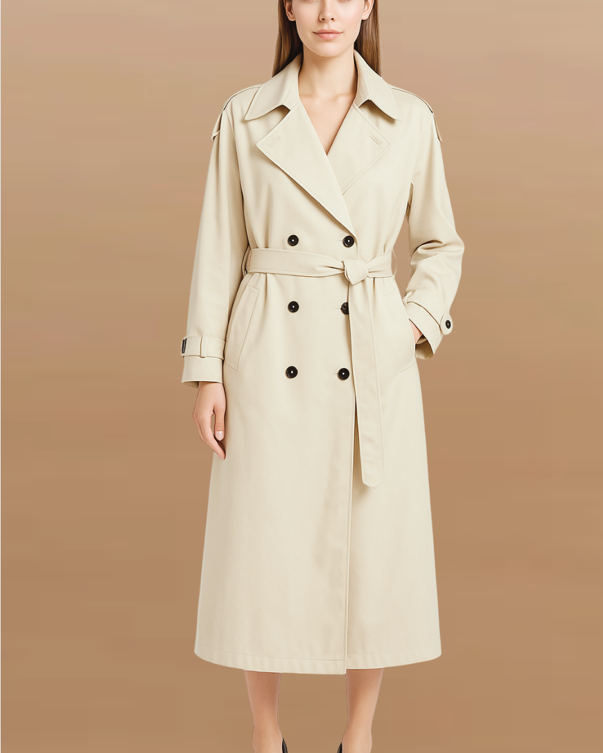 Një pallto trench me dizajn të gjatë, e përsosur për pranverë dhe vjeshtë.
